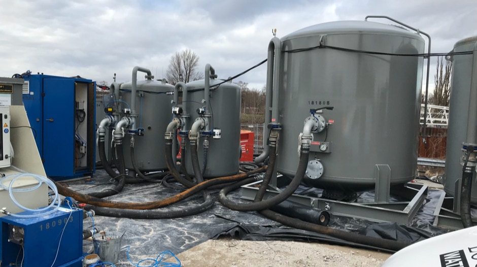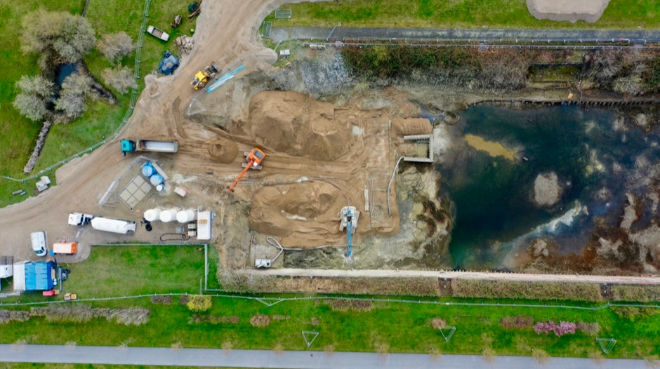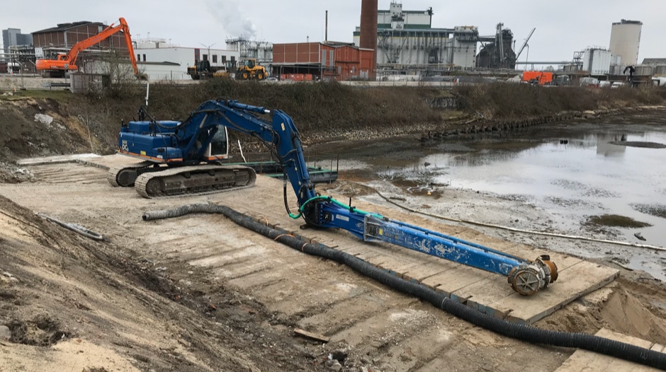 Massenstabilisierung mit der Hilfe eines Raupenbaggers inkl. hydraulischer Mischeinheit